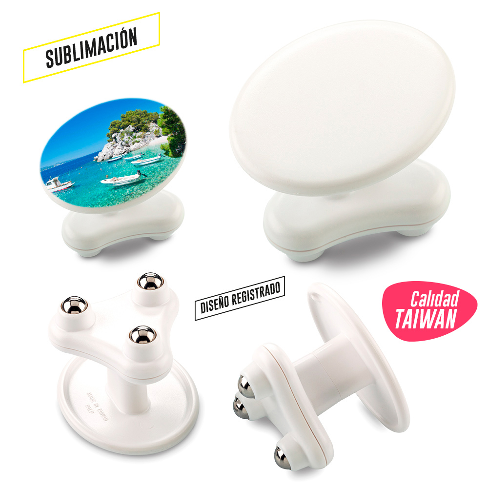 Mini masajeador plástico de tres puntas Medidas: 4,9 cm x 6 cm x 4,9 cm Marca: 6 cm x 4,8 cm / Impresión digital full color sobre rígidos (color blanco únicamente) / 3,5 cm / Tampografía